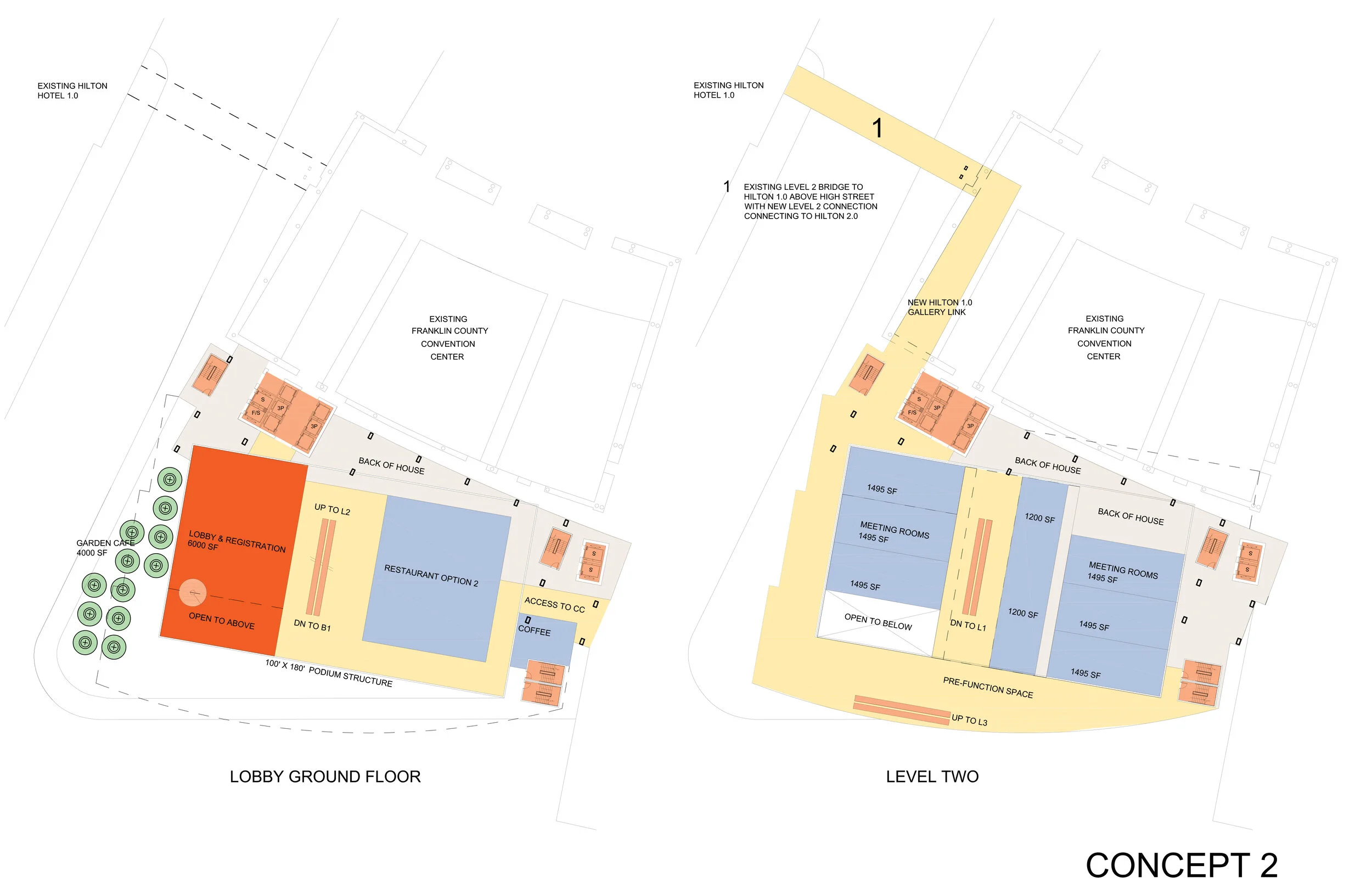 The new Hilton 2.0 Columbus Downtown Hotel includes 474 keys adjacent to the 532 key existing hotel, bringing the combined asset to 1000 keys, the ideal regional convention center hotel size. The program includes doubling the meeting & front and back of house spaces, adding a street level restaurant and a rooftop bar and restaurant. Project challenges and opportunities include how to organize the combined entity on two physical building sites operationally and functionally, as one single hotel.